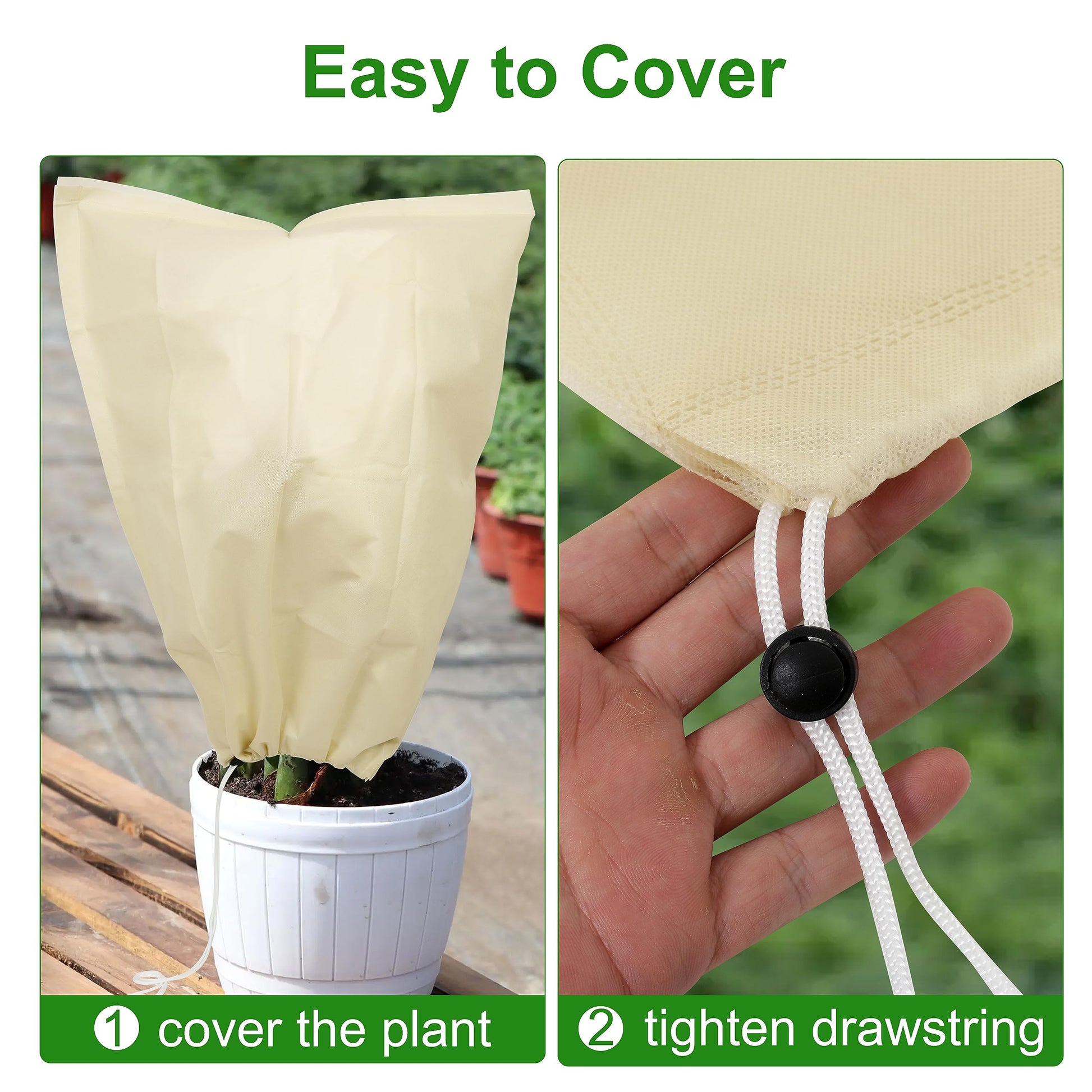 Állítható Húzózsinór – A húzózsinór kialakításának köszönhetõen állítható a feszesség, ami lehetõvé teszi, hogy különbözõ méretû és alakú növényekhez illeszkedjen. A burkolat rugalmas állítása kényelmet és optimális illeszkedést biztosít, így a hideg éghajlatokon vagy heves viharok esetén is biztonságos védelmet nyújt a növényeknek.