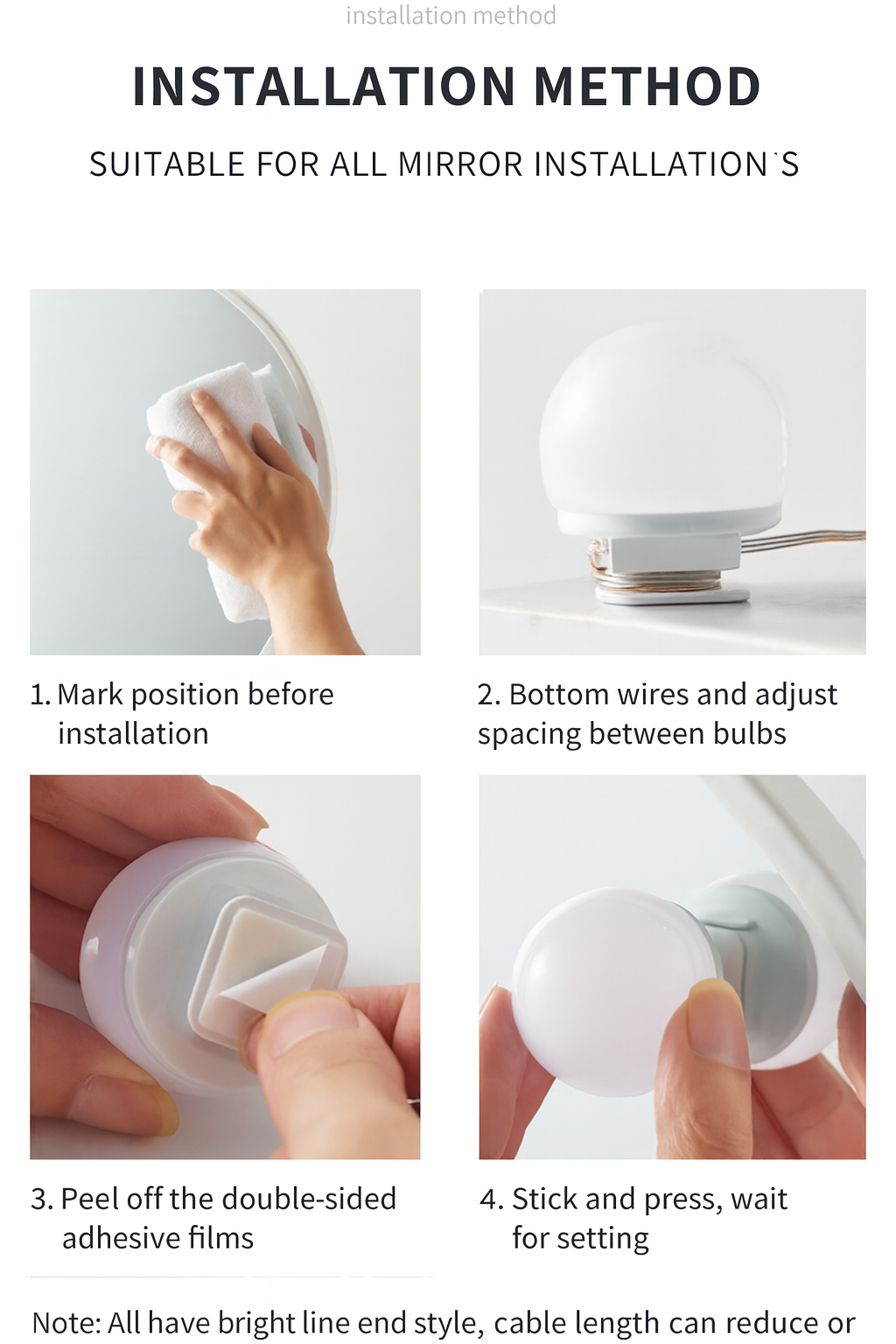 A LED sminklámpa készlet 10 fényerő-szabályozható izzót tartalmaz, amelyeket könnyedén felragaszthatsz bármilyen tükörre. Egyszerűen telepíthető, természetes fényt biztosít sminkeléshez, hajformázáshoz és mindennapi szépségápoláshoz.