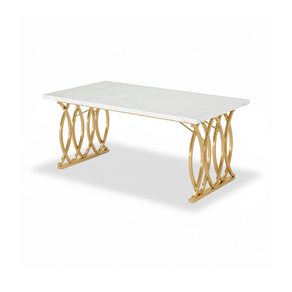 Vigyen kortárs eleganciát otthonába ezzel a lenyűgöző étkezőasztallal! A ragyogó, fehér márvány hatású asztallap és a művészi kialakítású, arany színű fém lábak kombinációja garantáltan az étkezője központi elemévé válik.