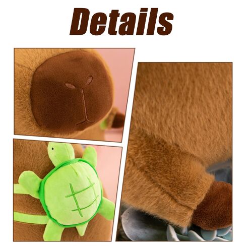 Ez a barna, bohókás kapibara plüss zöld plüssbékával a fején egyedi karakter, amely barátságos megjelenésével és puha textúrájával mindenkit levesz a lábáról.