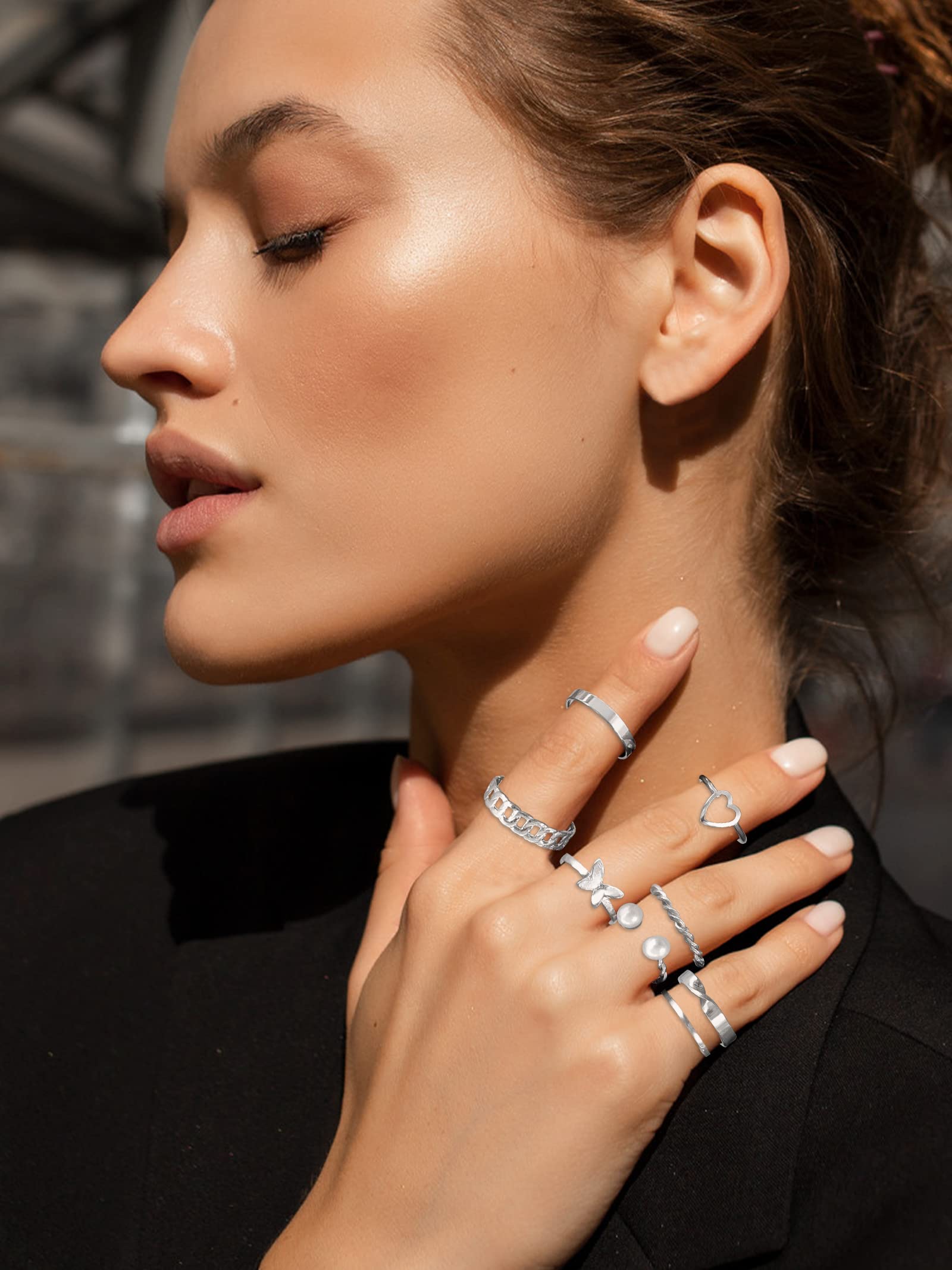 A szett részeként arany színű, különféle mintázatú gyűrűket is találsz: szív, gyöngy, pillangó, lánc és geometrikus formák. Viselheted őket külön-külön vagy egyszerre rétegezve, hogy mindig mást mutass a kezeiden.