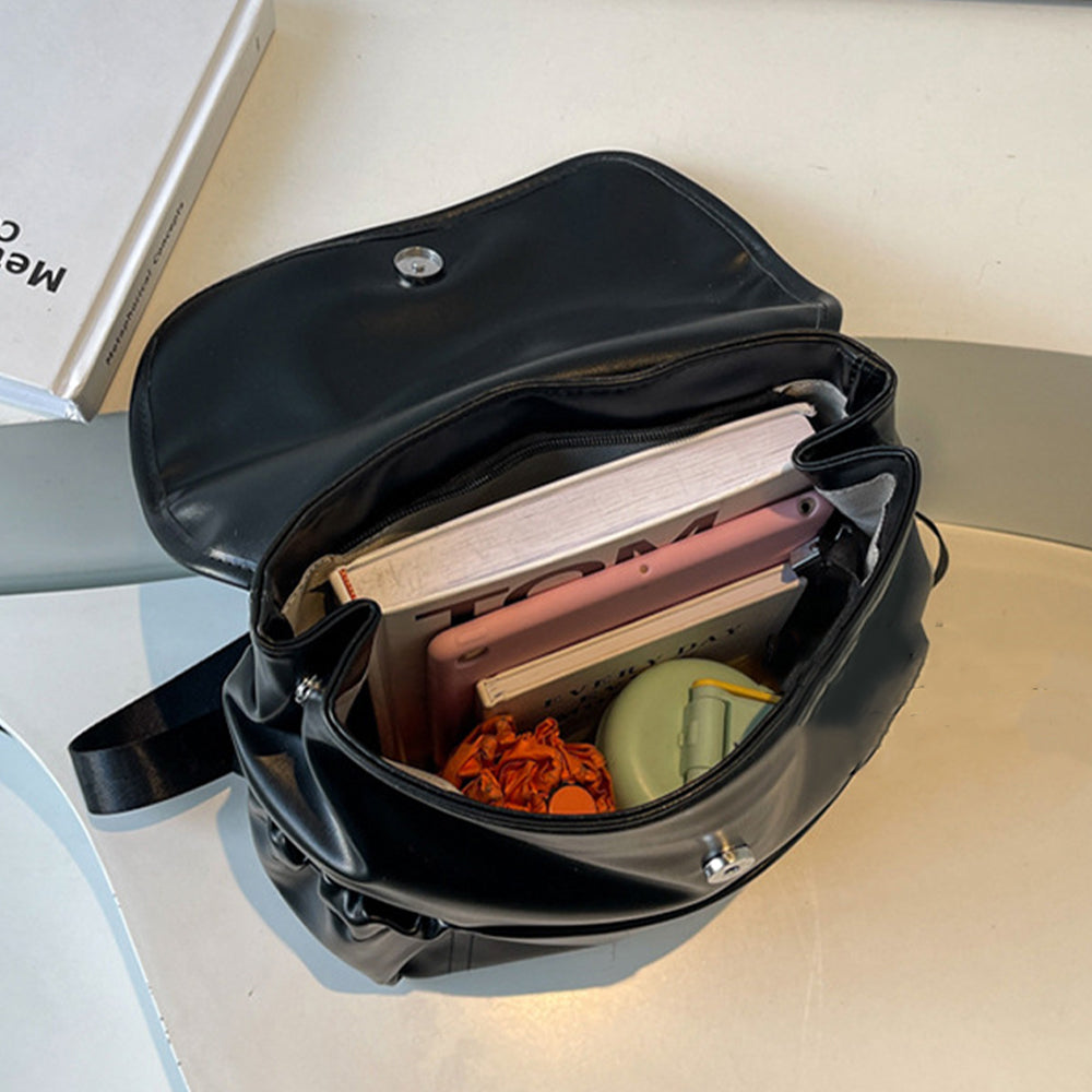 Dollcini Divatos Nagy Kapacitású Női Hátizsák – PU Bőrpántos, Minimalista, Iskolába, Munkába és Utazáshoz, Fényes Fekete