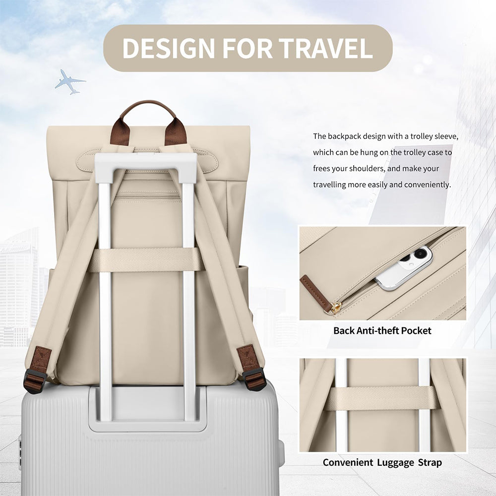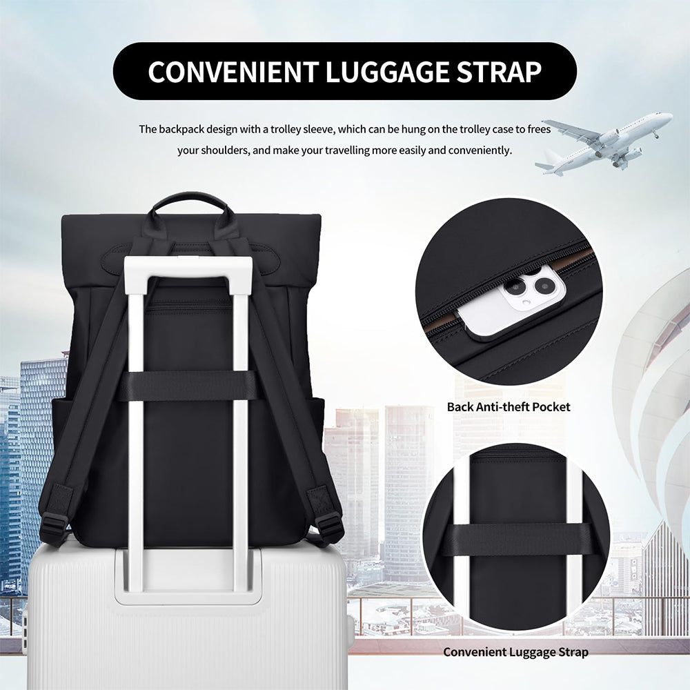 Az állítható, párnázott vállpántok csökkentik a váll- és hátterhelést. A hátoldalon található bőröndpánt lehetővé teszi a bőröndhöz való rögzítést, így megkönnyíti az utazást, különösen repülőn vagy vonaton. A felső fogantyúval kézben is hordható.
