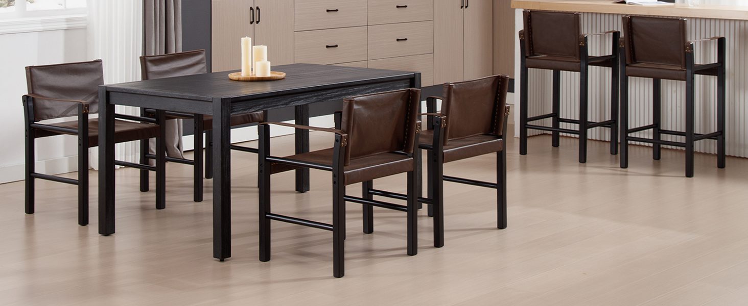 A masszív, fekete fa vázak stabil alapot és letisztult, ipari hangulatot kölcsönöznek, míg a gazdag barna, prémium bőr hatású ülő- és hátfelületek kifinomult megjelenést és egyszerű tisztíthatóságot garantálnak. Az ergonomikusan kialakított karfák mindkét széken extra támaszt és kényelmet nyújtanak a hosszabb beszélgetések során is.