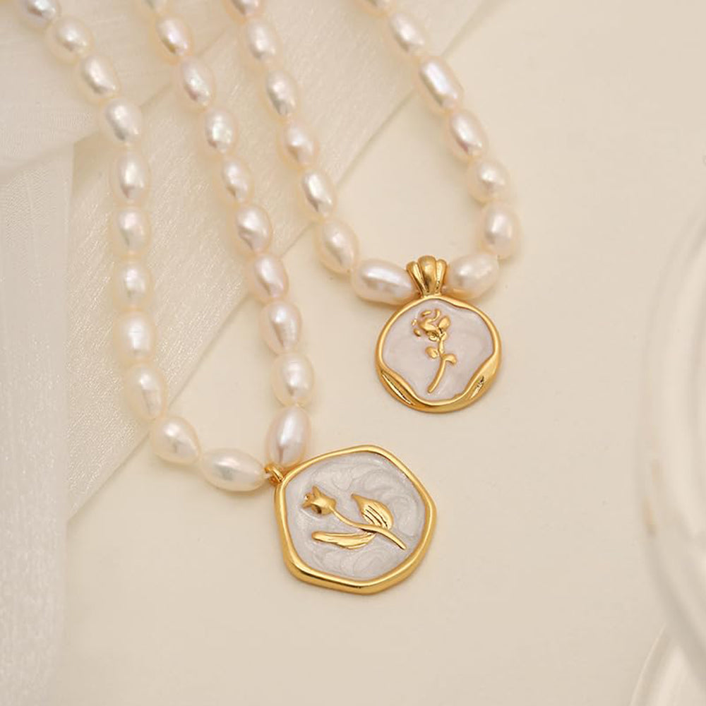 A francia romantika és a vintage nőiesség letisztult esszenciája. A lágy fényű gyöngysor finoman kiemeli a nyakat, a gyöngyházfényű, kézzel zománcozott virág medál pedig (rózsa vagy tulipán motívummal) azonnal különlegessé teszi a megjelenést.